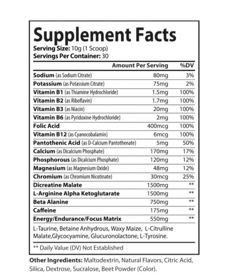 L-Citrulline, Beta-Alanine, Caffeine, L-Taurine, Dicreatine Malate, Vitaminas B y más…